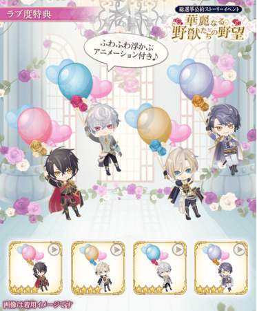 イベントでは、組み合わせることで彼と手を取り合いダンスを踊るポーズのアバターを始めとし、『イケメン王子 美女と野獣の最後の恋』を象徴する薔薇の花で彩られたこのイベント限定のアバターが獲得できます。