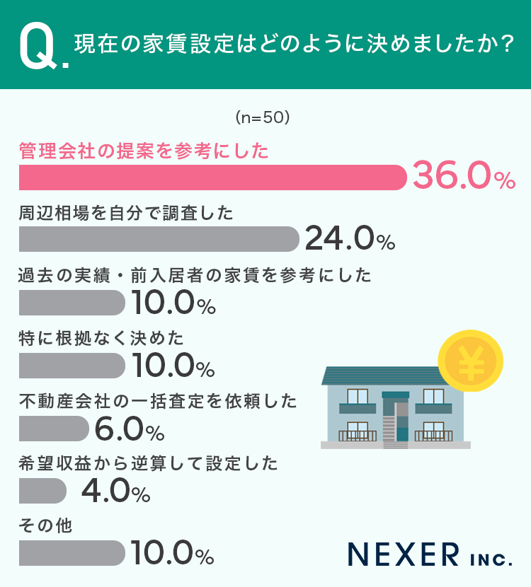 多くのオーナーが、家賃を決める際に管理会社の提案を重視していることがわかります。周辺相場に詳しい不動産のプロとして、判断材料になると考える人が多いのでしょう。