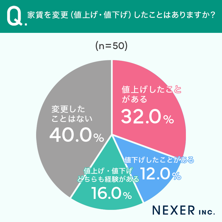 「変更したことはない」と回答したオーナーは40%でした。一方、残りの60%は、何らかの形で家賃を変更した経験があります。