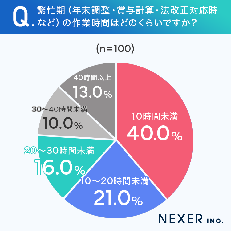 繁忙期では「10時間未満」と回答した方が40%で最多で、「10〜20時間未満」が21%、「20〜30時間未満」が16%、「30〜40時間未満」が10%、そして「40時間以上」が13%という結果になりました。