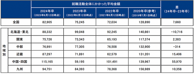 就職活動費用は平均8万2,905円と、交通費などを中心に2023年卒より7,660円増加。