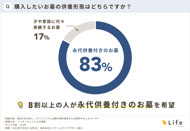 ライフドットが調査したデータによると、「永代供養付きのお墓を購入したい」と考える人は83%もいることがわかりました。