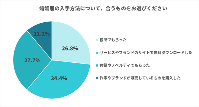 それに合わせ、婚姻届の入手方法に関する調査を行いました。その結果、約7割以上の人が「好みに合うものを選びたい」と回答し、役所以外の方法で入手していることがわかりました。
