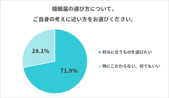 調査の結果、約7割以上の人が好みに合う婚姻届を選びたいと考えていることがわかりました。昨今では多くの企業やサービスが、オリジナル婚姻届を提供している背景もあり、婚姻届の選び方や入手方法も多様化していることがわかります。