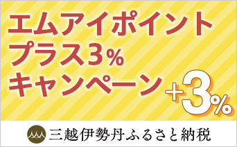対象期間中に『三越伊勢丹ふるさと納税』ポータルサイトより(株)エムアイカード発行のカードで寄附されたお客さまを対象に、エムアイカードご利用の「通常ポイントに加えてプラス3%」をプレゼント。期間中何度でもご参加いただけます。