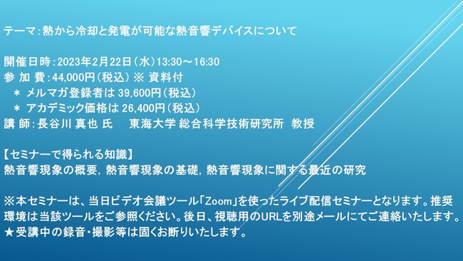先端技術情報や市場情報を提供している(株)シーエムシー・リサーチ(千代田区神田錦町: https://cmcre.com/ )では、 各種材料・化学品などの市場動向・技術動向のセミナーや書籍発行を行っておりますが、 このたび「熱から冷却と発電が可能な熱音響デバイスについて」と題するセミナーを、 講師に長谷川 真也 氏 (東海大学 総合科学技術研究所 教授)をお迎えし、2023年2月22日(水)13:30より、 ZOOMを利用したライブ配信で開催いたします。 受講料は、 一般:44,000円、 弊社メルマガ会員:39,600円、 アカデミック価格は26,400円となっております(資料付)。