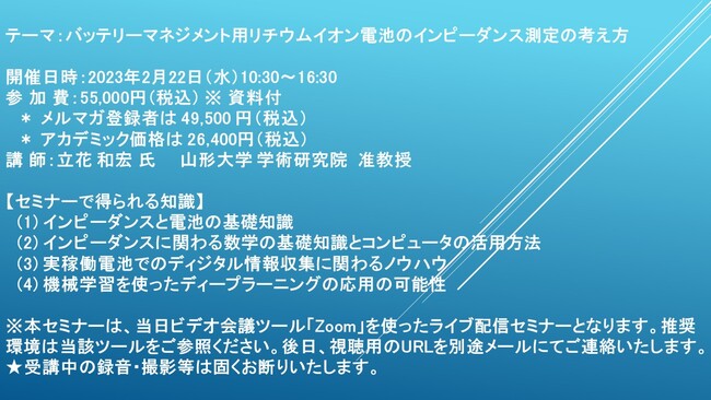 先端技術情報や市場情報を提供している(株)シーエムシー・リサーチ(千代田区神田錦町: https://cmcre.com/ )では、 各種材料・化学品などの市場動向・技術動向のセミナーや書籍発行を行っておりますが、 このたび「バッテリーマネジメント用リチウムイオン電池のインピーダンス測定の考え方」と題するセミナーを、 講師に立花 和宏 氏 (山形大学 学術研究院 准教授)をお迎えし、2023年2月22日(水)10:30より、 ZOOMを利用したライブ配信で開催いたします。 受講料は、 一般:55,000円、 弊社メルマガ会員:49,500 円、 アカデミック価格は26,400 円となっております(資料付)。