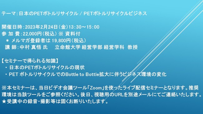 先端技術情報や市場情報を提供している(株)シーエムシー・リサーチ(千代田区神田錦町: https://cmcre.com/ )では、 各種材料・化学品などの市場動向・技術動向のセミナーや書籍発行を行っておりますが、 このたび「日本のPETボトルリサイクル / PETボトルリサイクルビジネス」と題するセミナーを、 講師に中村 真悟 氏 (立命館大学 経営学部 経営学科 教授)をお迎えし、2023年2月24日(金)13:30より、 ZOOMを利用したライブ配信で開催いたします。 受講料は、 一般:22,000円、 弊社メルマガ会員:19,800円となっております(資料付)。