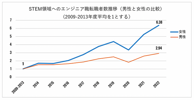 1.STEM領域への女性の転職者数はこの約10年で6.38倍と増加。男性の2.94倍と比べても大きく増加している。
