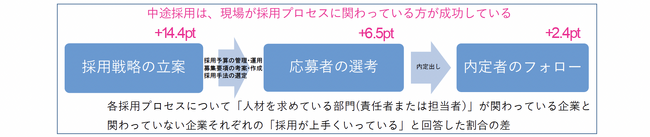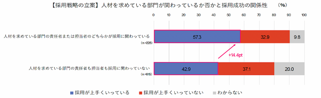 人材を求めている部門の「責任者」または「担当者」が採用戦略に関わっている方が、「採用が上手くいっている」と回答した割合が14.4pt高い