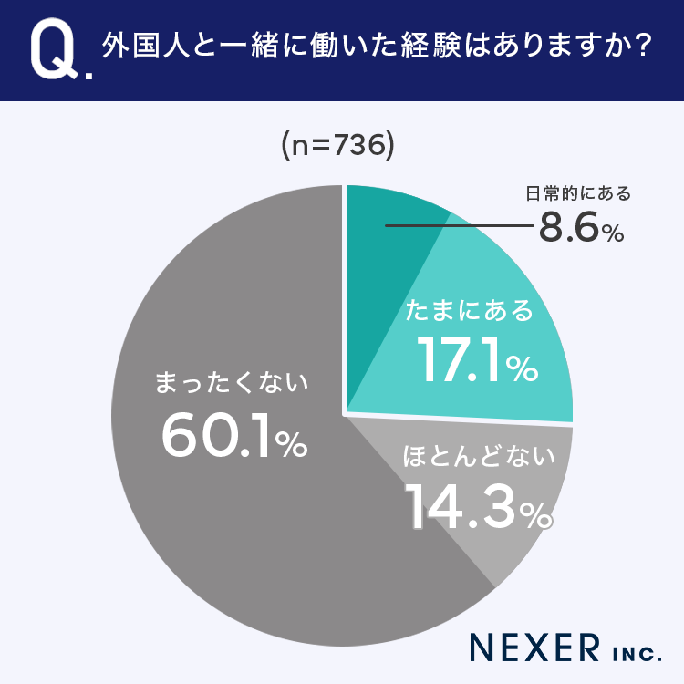「日常的にある」が8.6%、「たまにある」が17.1%という結果となり、合わせて25.7%の方が外国人と一緒に働いた経験があると回答しました。
