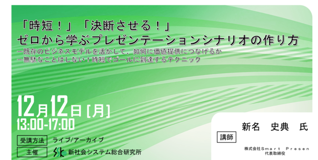 「時短!決断!ゼロから学ぶプレゼンテーションシナリオ」と題して株式会社Smart Presen 新名 史典氏のセミナーを2022年12月12日(月)に開催!!