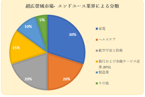 その中でも、家電は超広帯域市場の主要なサブセグメントになると予想されています。UWB 技術は、パーソナル コンピューター、ラップトップ、テレビ、スマートフォン、スマート ウォッチなどの家庭用電化製品で、より優れたワイヤレス接続とより高い精度を実現するために広く使用されています。