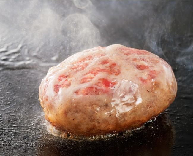 プレミアムもとぶ牛のしっかりとした肉質がお楽しみいただける粗挽き仕立て。ハンバーグを包む網脂は肉汁を閉じ込めながら火を通していくため、まろやかで ジューシーな焼きあがりに。