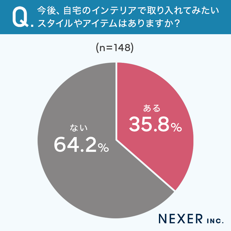 その結果「ある」と回答した方は35.8%でした。約3人に1人が、今のインテリアに満足しつつも、新しい要素を加えたいと考えていることがわかります。