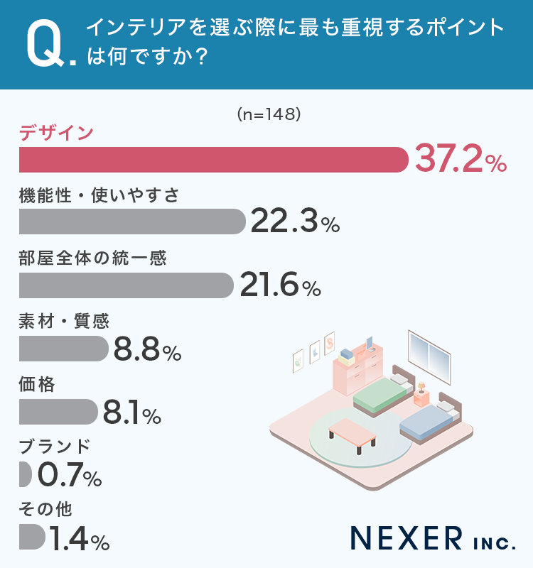 ■37.2%が、インテリア選びで最も重視するのは「デザイン」と回答