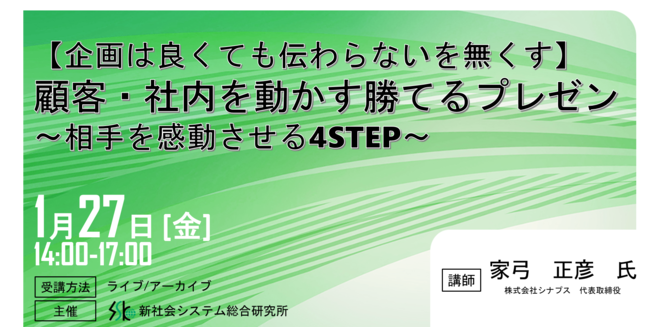 「顧客・社内を動かす勝てるプレゼン」と題して株式会社シナプス 代表取締役 家弓 正彦氏のセミナーを2023年1月27日(金)に開催!!