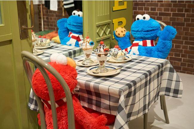 エルモをはじめ店内外に配置されたキャラクター達の等身大フィギュアや、クッキーモンスタービッグバードの毛や羽の素材感を再現したライト、またカフェコーナーの油絵タッチによる額装アートやテーブルセットもセサミストリートの世界観を忠実に表現しており、足を踏み入れるだけで心躍る演出とともに皆様をお出迎えいたします。