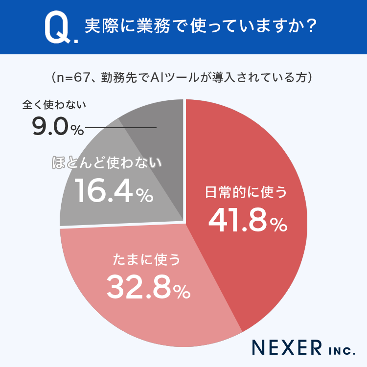 その結果「日常的に使う」が41.8%、「たまに使う」が32.8%で、合わせて約75%がAIツールを業務に取り入れています。一方「ほとんど使わない」が16.4%、「全く使わない」が9.0%と、約25%は導入されていても活用できていません。