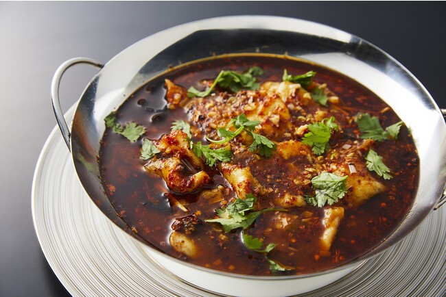 四川省重慶で人気のある料理。白身魚と野菜を花椒など香辛料を効かせたスープで煮込み、最後に高温の油をかけて香り高く仕上げました