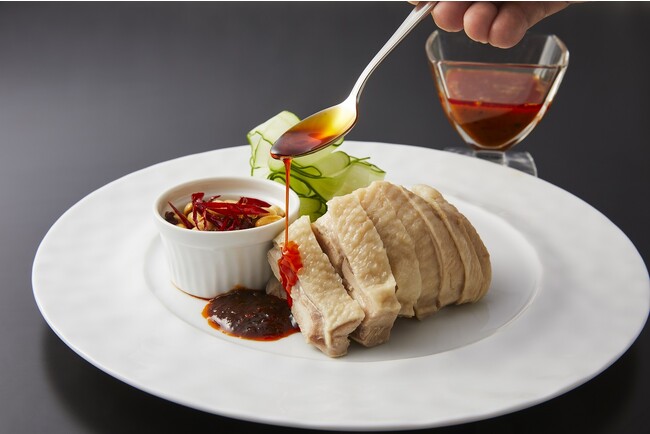 中国語で「複雑な味」を意味する“怪味(カイミ―)ソース”と、唐辛子・山椒ベース爽やかで痺れる辛さの“よだれ鶏ソース”の二種類のソースで味わう蒸し鶏。付け合わせに、麻辣ピーナッツを添えました。