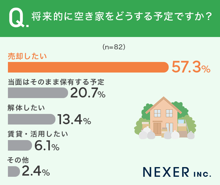 今回の調査では、空き家を所有している、または将来所有する可能性がある方の75.7%が放置リスクを認識しており、処分方法としては「売却」の認知度が87.8%と最も高い結果となりました。実際に将来の予定を聞いたところ、57.3%が売却を希望しています。