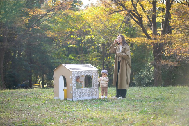 子どもが自由にお絵描きをしながらオリジナルの家を作っていく、再生素材であるダンボール製の組み立て式キッズハウス。三越伊勢丹オンラインストアでの販売となります。