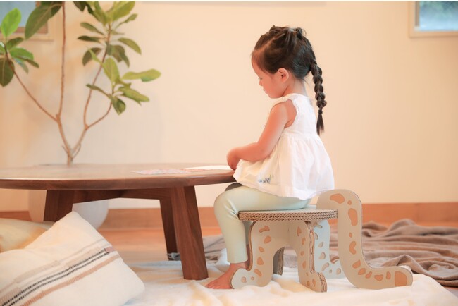 絶滅危惧種であるユキヒョウをモチーフにした、親子で一緒に組み立てることができる再生素材のダンボール製スツールです。