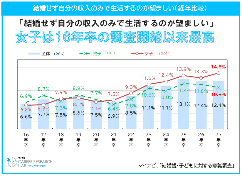 男子学生の結婚後の共働き希望は、調査開始以来最高。一方、「結婚せず自分の収入のみで生活する」女子学生も調査開始以来最高に。20代正社員の約5人に1人は「結婚したくない」、30代では約3人に1人