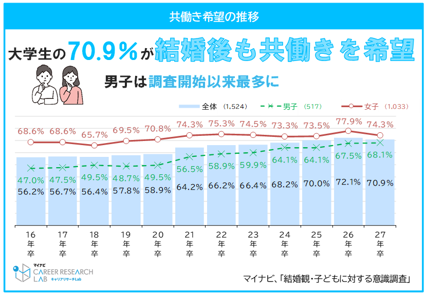 2027年3月卒業予定の学生に結婚後の仕事について聞くと、共働きを希望する割合は全体で70.9%(前年比1.2pt減)だった。男女別では、男子68.1%(前年比0.6pt増)、女子74.3%(前年比3.6pt減)で、男子は調査開始以来最高となった。また、男女の割合の差は6.2ptとなり、調査開始以来最も低い値だった。