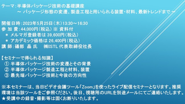 先端技術情報や市場情報を提供している(株)シーエムシー・リサーチ(千代田区神田錦町: https://cmcre.com/ )では、 各種材料・化学品などの市場動向・技術動向のセミナーや書籍発行を行っておりますが、 このたび「半導体パッケージ技術の基礎講座〜 パッケージ形態の変遷、製造工程と用いられる装置・材料、最新トレンドまで 〜」と題するセミナーを、 講師に礒部 晶 氏 ((株)ISTL 代表取締役社長)をお迎えし、2023年5月25日(木)13:30より、 ZOOMを利用したライブ配信で開催いたします。 受講料は、 一般:44,000円(税込)、 弊社メルマガ会員:39,600円(税込)、 アカデミック価格は26,400円(税込)となっております(資料付)。