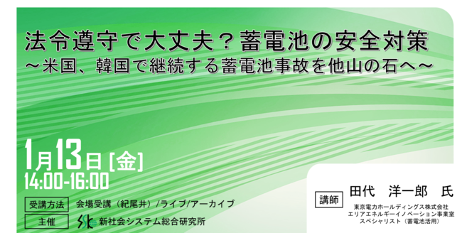 「法令遵守で大丈夫?蓄電池の安全対策」と題して、東京電力ホールディングス(株) エリアエネルギーイノベーション事業室 スペシャリスト 田代 洋一郎氏のセミナーを2023年1月13日(金)に開催!!