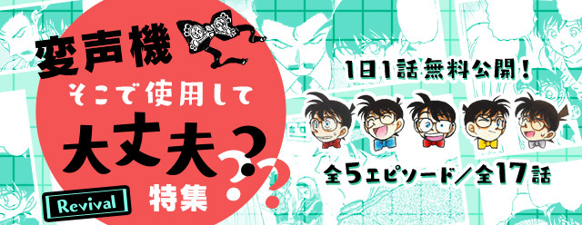 本特集では、「変声機そこで使用して大丈夫?」と疑問に思うようなエピソードを集めた特集をリバイバルします。「名探偵コナン公式アプリ」内にて、全5エピソード17話を、1日1話無料でお読みいただくことができ、さらにプレミアムクラブ会員の方は、公開された話は期間中いつでも無料購読できます。また、会員ではない方も期間中、第53・54巻の「黒の組織の影[謎の高額報酬/真珠の流れ星]」と各エピソードの1話目は、公開後いつでも無料購読できます。