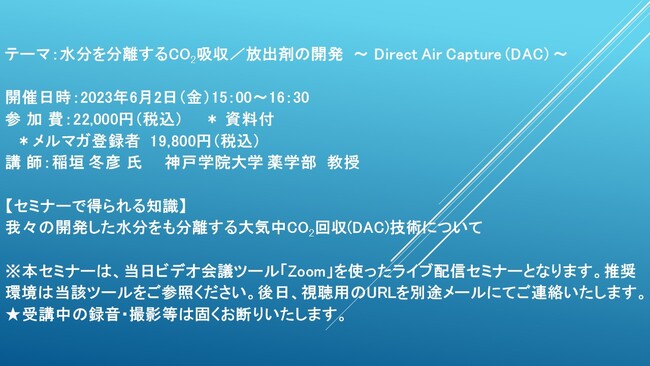 先端技術情報や市場情報を提供している(株)シーエムシー・リサーチ(千代田区神田錦町: https://cmcre.com/ )では、 各種材料・化学品などの市場動向・技術動向のセミナーや書籍発行を行っておりますが、 このたび「水分を分離するCO2吸収/放出剤の開発 〜 Direct Air Capture (DAC) 〜」と題するセミナーを、 講師に稲垣 冬彦 氏 (神戸学院大学 薬学部 教授)をお迎えし、2023年6月2日(金)15:00より、 ZOOMを利用したライブ配信で開催いたします。 受講料は、 一般:22,000円(税込)、 弊社メルマガ会員:19,800円(税込)となっております(資料付)。