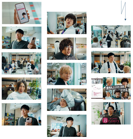 『ホットペッパービューティー』を見て美容室に来たコットンの西村さん。「ホットペッパービューティーに載っていたとおりだ!お客さんのほとんどが男性で、若者からビジネスマンまで幅広い年齢層!」と驚いた様子。すると「君は、この美容室はじめてかい?」と尋ねる茶髪ロングヘアの男性客。「ここはいいですよ。男でも入りやすいし」とマッシュヘアのサブカル風の男性客からも立て続けに話しかけられます。続いて、シャンプー台に座っているパーマヘアの男性が「店長の腕にかかれば、無造作系から」とウインク。金髪ヘアの男性が「キレイ系」と続くと「こんなのも」とパーマ中の男性が自分の頭を指さしニッコリ。さまざまなヘアスタイルの男性客たちだが、実はすべてコットンのきょんさん。