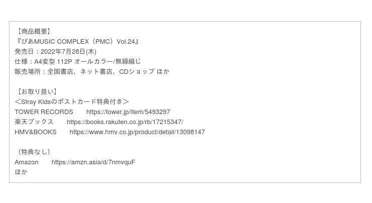 なお、タワーレコード、HMV&BOOKS、楽天ブックスでご予約・ご購入の方には、先着で表紙を飾るStray Kidsのポストカードが付きます(販売店舗別で絵柄が違います)(数に限りがあります)。
