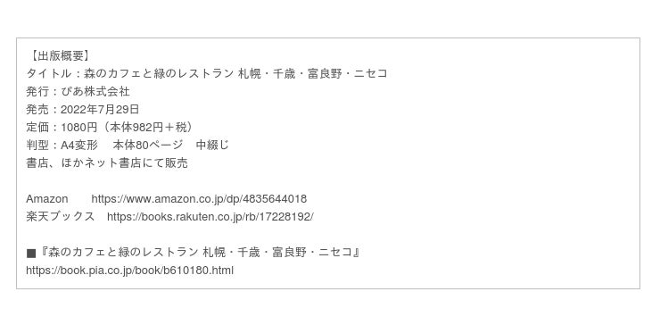 ■『森のカフェと緑のレストラン 札幌・千歳・富良野・ニセコ』https://book.pia.co.jp/book/b610180.html