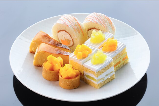 中段には、完熟マンゴーをふんだんにあしらった「マンゴーショートケーキ」、糖度14度以上の極上マスクメロンを使用したメディアでも話題の「スーパーメロンショートケーキ」にふんわりとしたロール生地にピーチを包み込んだ「ピーチーロール」に「マンゴータルト」、女性に人気の「豆乳バスクチーズケーキ」をご用意。