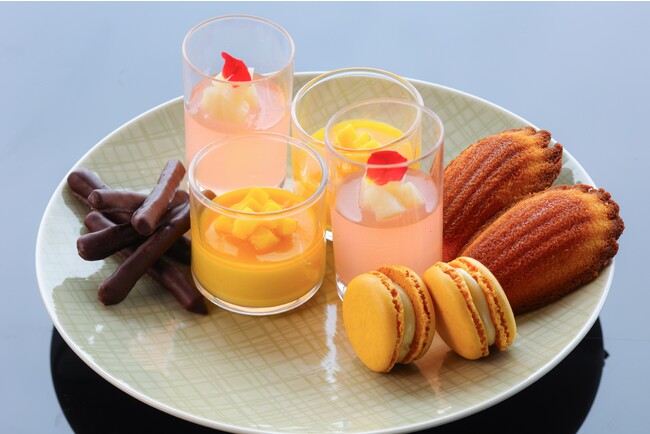 上段は「マンゴープリン」に「ピーチゼリー」など見た目もさわやかなグラススイーツに、マカロンやマドレーヌなど味覚と視覚の両方で楽しめるスイーツをご堪能いただけます。
