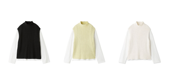 過去人気を博した、シンプルな長袖カットソーとハイネックベストのセットアイテムをリバイバル。
