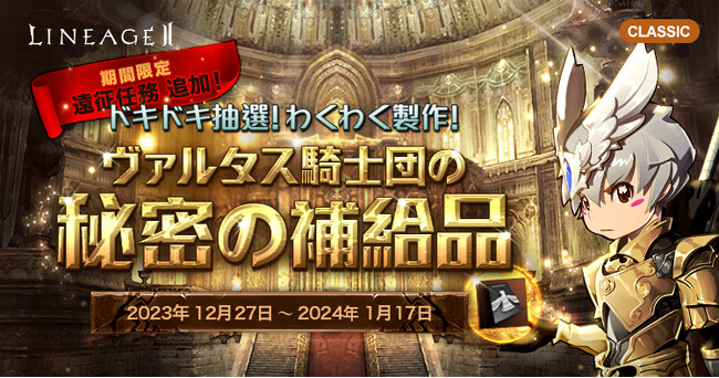 PC向けオンラインゲーム『リネージュ2』をサービス、運営しているエヌ・シー・ジャパン株式会社(東京都港区、代表取締役:金 澤憲(キム テクホン))は、2023年12月27日(水)に、ライブサービス/クラシックサービス/アデンサービスでの各種イベントの開催をお知らせします。