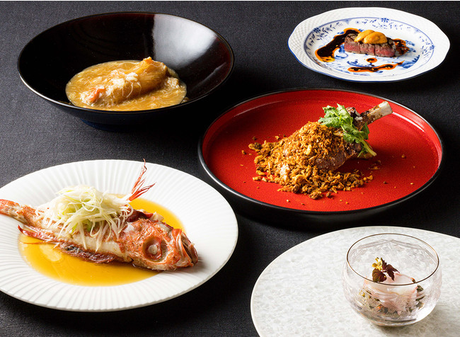 「北海道根室より届いたキンキの蒸し物」(料理写真内・左手前)は、北海道の高級魚「キンキ」を蒸すことでふっくら柔らかく仕上げた逸品。脂がのったジューシーな魚の身を、特製醤油と香り高い葱オイルとご一緒にご堪能ください。また、四川飯店伝統の醤油味で煮込んだ毛鹿鮫尾ビレの煮込みには、2種のカニの身を用いた濃厚なソースを合わせました。この他、十勝若牛肩ロースや中札内田舎どり、水ダコなど中国料理×北海道食材の味わいを存分にお楽しみください。