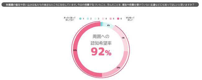 さらに、授業を受けた生徒の92%が、「無意識の偏見や思い込み」に対して得られた学びや気づきを、家族や友人などの周囲にも認知してもらいたいと回答しました。本教材を活用した授業を通じて、身近なところからでも、一人ひとりが主体的に考え、取り組んでいくことの大切さを伝えることができました。