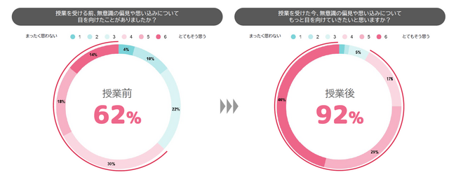 授業を受けた生徒のアンケート※1 によると、授業前の無意識の偏見や思い込みについて「目を向けたことがある」と回答した生徒は62%でしたが、授業後は92%が「もっと目を向けていきたい」と回答し、30%の意識変化がありました。