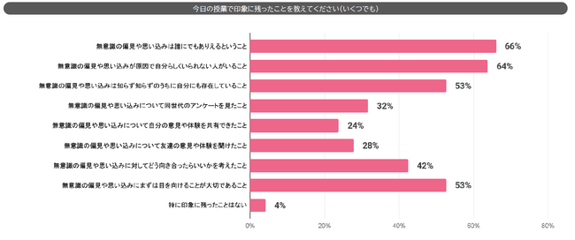 本教材の特徴として、まずは「無意識の偏見や思い込み」を知り(SEE)、そして議論し(SAY)、これからアクションを起こす(DO)取り組みについて、中高生に学びと気づきを深めてもらえるような内容となっています。今回、印象に残ったことで最も多く挙げられたのは、「無意識の偏見や思い込みは誰にでもありえるということ」 66%、次いで「無意識の偏見や思い込みが原因で自分らしくいられない人がいること」 64%でした。また、「無意識の偏見や思い込みにはまずは目を向けることが大切であること」、「無意識の思い込みは知らず知らずのうちに自分にも存在していること」は53%、「無意識の思い込みに対してどう向き合ったらいいかを考えたこと」が42%でした。