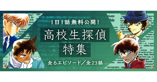 本特集では、「工藤新一」や「服部平次」などの高校生探偵たちが登場するエピソードをピックアップした特集を実施します。「名探偵コナン公式アプリ」内にて、全6エピソード23話を、1日1話無料でお読みいただけます。プレミアムクラブ会員の方は、公開された話は期間中いつでも無料購読できます。会員ではない方も期間中、第21巻の「空飛ぶ密室 工藤新一最初の事件」と各エピソードの1話目は、公開後いつでも無料購読できます。