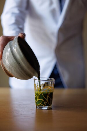 目の前で点てた抹茶をオリジナルデザイングラスに入れて提供。鮮やかな水色(すいしょく・お茶の色)とふくよかな味わいを。グラスごとお持ち帰りいただけます。