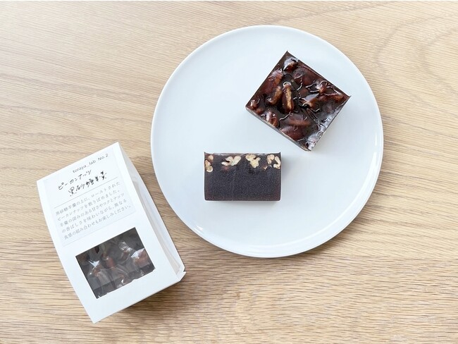 黒砂糖羊羹の上に、ローストされたピーカンナッツを散りばめました。羊羹の深みのある甘さやコクとナッツの香ばしさを味わいながら、異なる食感の組み合わせもお楽しみいただけます。
