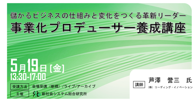 「事業化プロデューサー養成講座」と題して、(株)リーディング・イノベーション 代表取締役社長 新規事業開発上級職人 芦澤 誉三氏によるセミナーを2023年5月19日(金)に開催!!