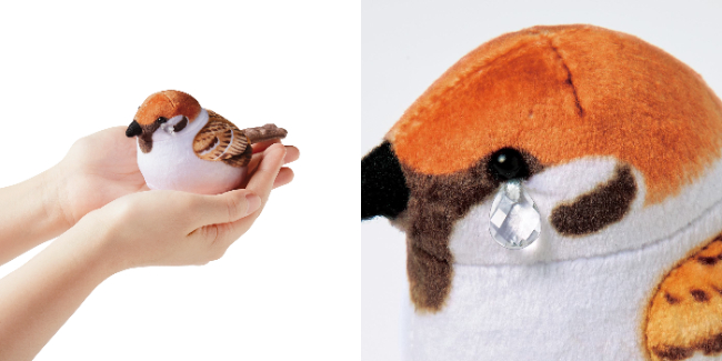 ふっくらかわいい冬毛のすずめのリアルサイズです。きらりと輝く涙はしずく形のビーズで表現しています。